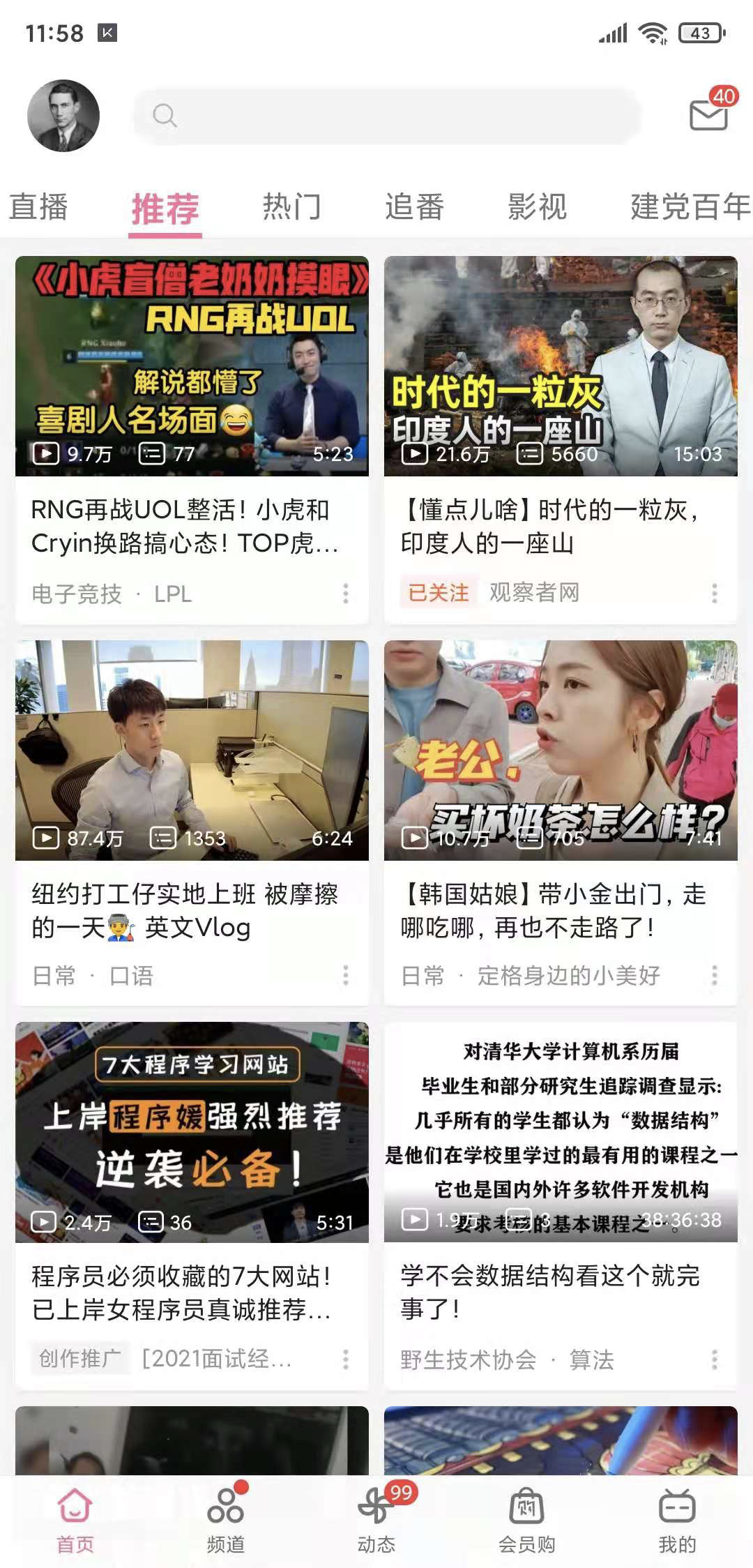 我平时喜欢财经、IT,休闲时看看LOL,也关注了观察者网,和几位中美家庭的up主,然后他的推荐还是挺符合这些特征的;
